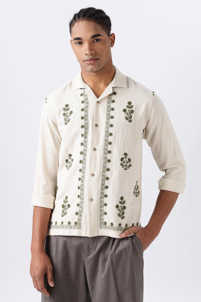 Olive Grove Pure Cotton-Linen Embroidered Shirt