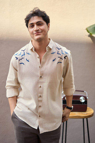 Texas Beige Camp Collar Full-sleeve Embroidery Shirt