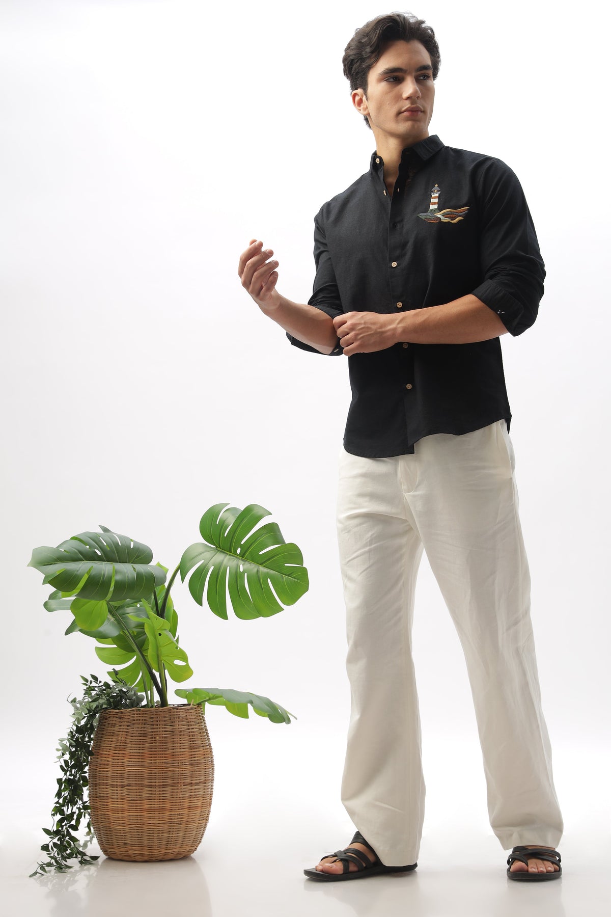 Crafted from 100% cotton yarn and coconut shell buttons, this natural linen coloured shirt is your point to stand out. The detailed lighthouse embroidery on the pocket area will be the 'lights that guide you home'.