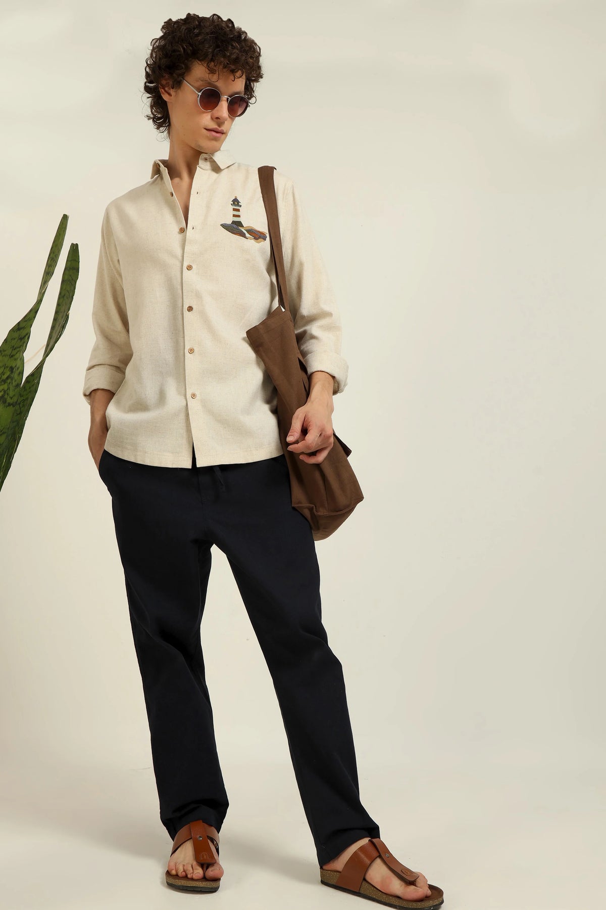 Crafted from 100% natural yarn and coconut shell buttons, this natural linen coloured shirt is your point to stand out. The detailed lighthouse embroidery on the pocket area will be the 'lights that guide you home'.