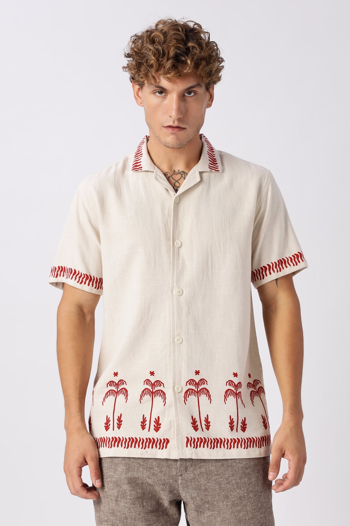 Inspired by the quiet rhythm of desert oases, the Red Dune shirt features palm and flame-like motifs print in striking red. Lightweight yet bold, this Cuban-collared piece pairs effortlessly with breezy trousers or shorts. Ideal for sundowners, getaway brunches, or slow evenings by the coast.