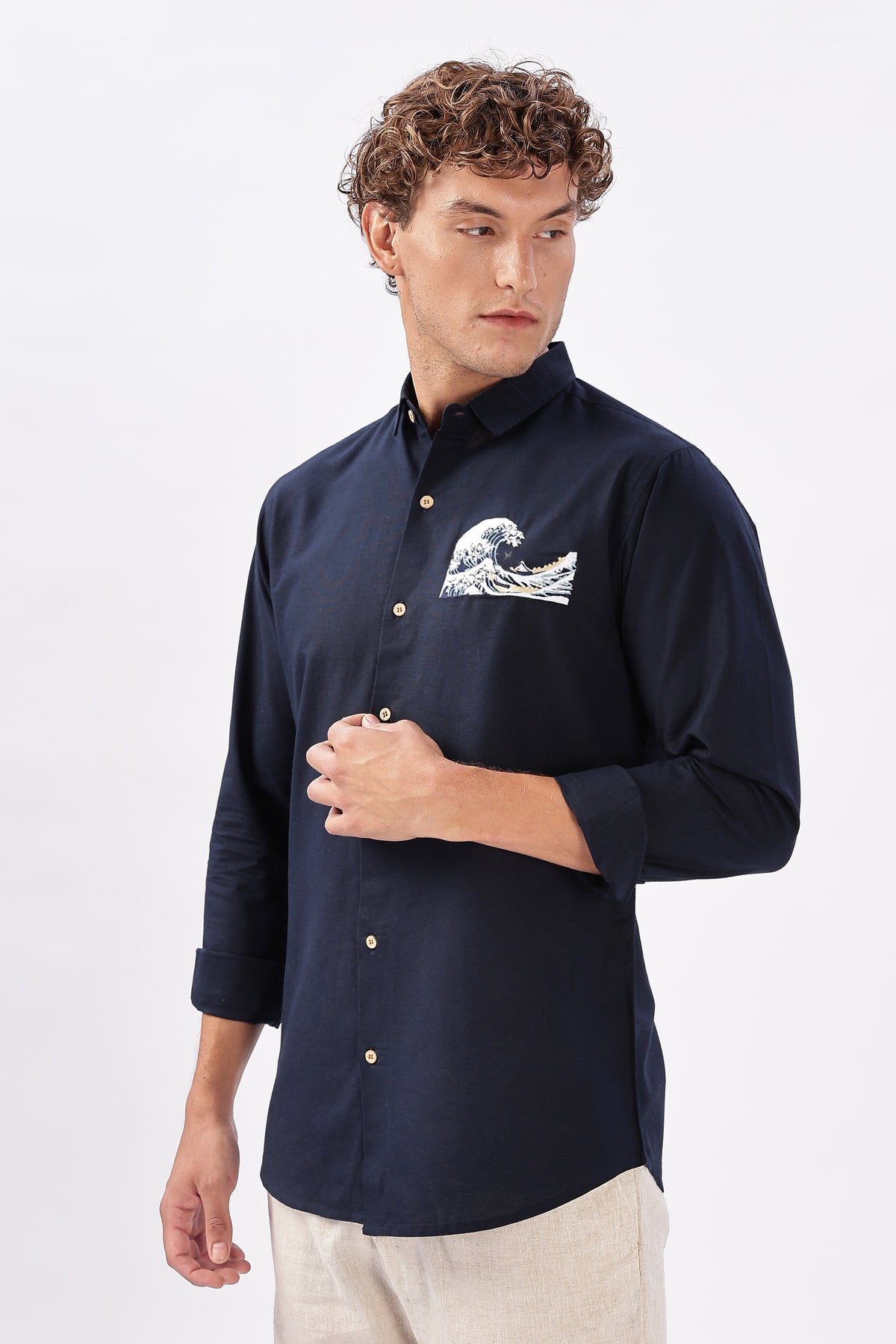 Inspired by the mesmerizing rhythm of waves and tides, this shirt captures the serene yet powerful essence of the ocean. Designed on a backdrop of crisp, high-quality fabric, this shirt offers a perfect balance of sophistication and coastal charm.