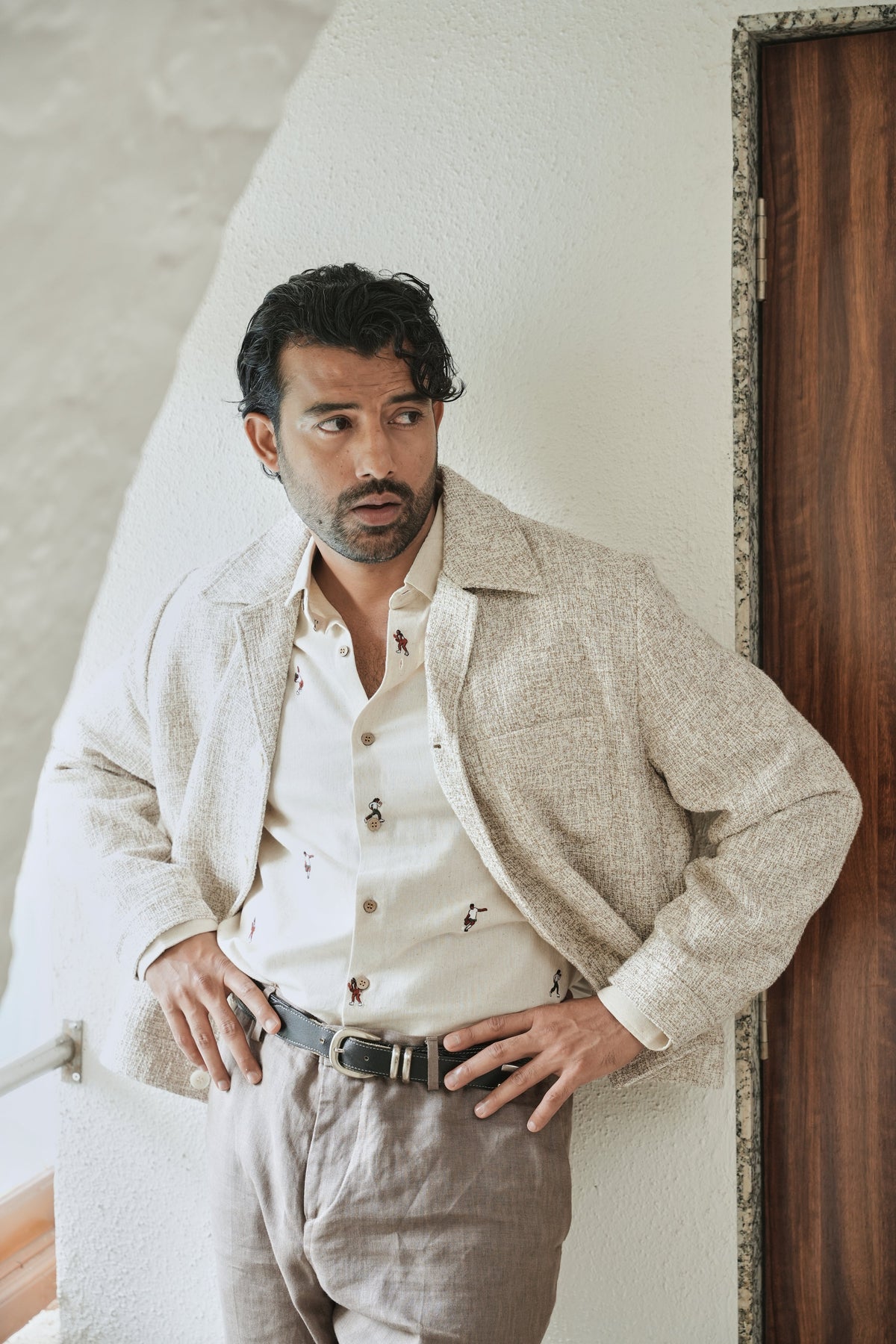 Ease meets artistry in the Men’s Beige Play Mode Embroidered Shirt. Crafted from a soft, breathable cotton-linen blend, this sun-washed beige shirt features playful yet refined embroidery across the chest. A nod to off-duty charm and weekend spontaneity. Its relaxed tailoring, clean collar and understated detailing make it versatile enough for coastal getaways, café afternoons or creative workdays.